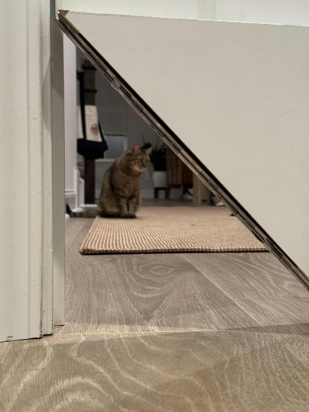 Purrfect solution to my problem. I work from home and often close my door while on calls so as not to disturb others. Without fail it is at this time that kitty decides it’s time to leave the room, and now she can without me needing to step out of frame to open the door.